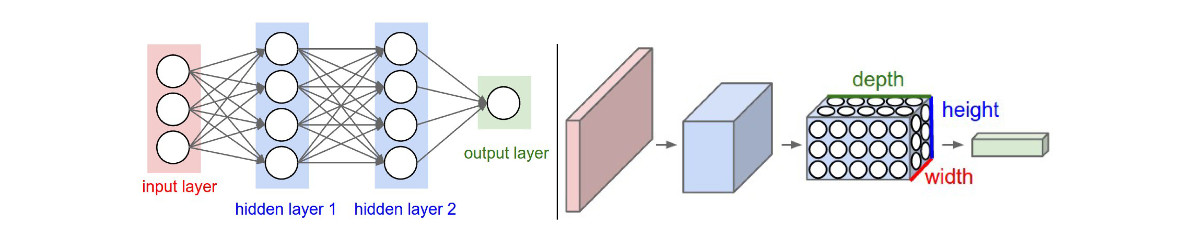 기존 classifier과 neural network와 다른 점은 ConvNet의 layer들이 3차원의(width,height,depth) 뉴런으로 이루어져 input data의 spatial structure을 유지하며 학습한다는 것이다. (기존에는 하나의 긴 vector로 만들었음) 즉, 각 layer은 3차원 volume을 입력으로 받아 미분 가능한 함수를 거쳐 다시 3차원 volume을 출력한다. 이때 각 layer의 뉴런들이 input의 특정 지역(small region)과 연결되어 이 부분만 학습을 진행한다.
