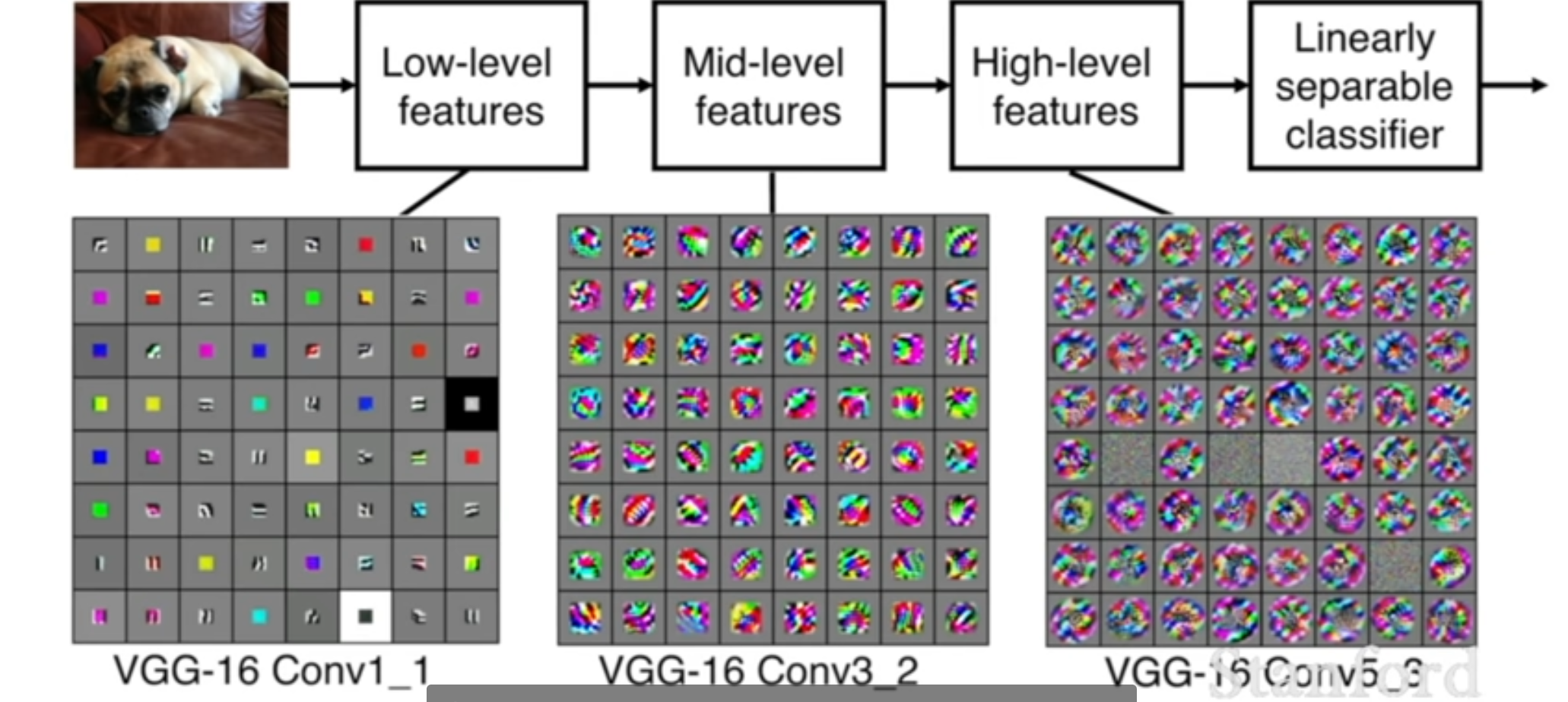 처음에는 그냥 모서리를 확인할 수 있다가 나중에는 정확히 코너를 찾는 것과 같이 layer가 깊어질 수록 더욱 더 복잡한 것을 발견 가능하다. 다만 activation map을 보게 되면 처음에만 사람이 이해할 수 있는 형태가 되고 그 후에는 사람이 보기에 어떤 의미가 있는지 확인하기 어렵다