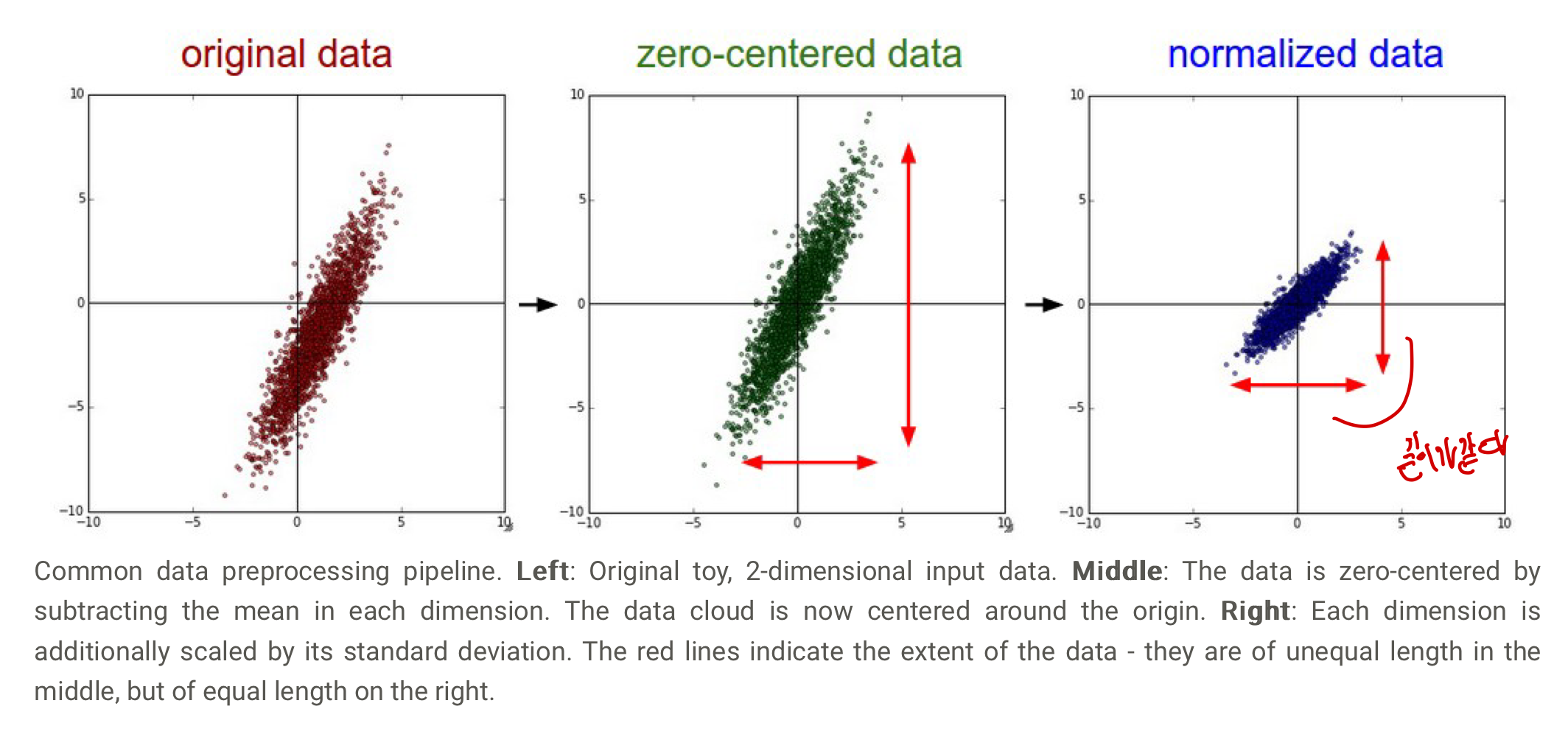 또한 input data에 있는 어떠한 형태의 noise들도 결국에 최적의 의 값을 찾는데 영향을 미칠 수 있기 떄문에 mean subtraction이 필요로 한다. 이미지처리에서는 주로 이 부분까지만 주로 진행하는데 이미지의 pixel 정보가 이미 상대적으로 비교와 학습이 가능한 규모와 분포를 가졌기 떄문에 굳이 normalization을 진행하지 않아도 된다.