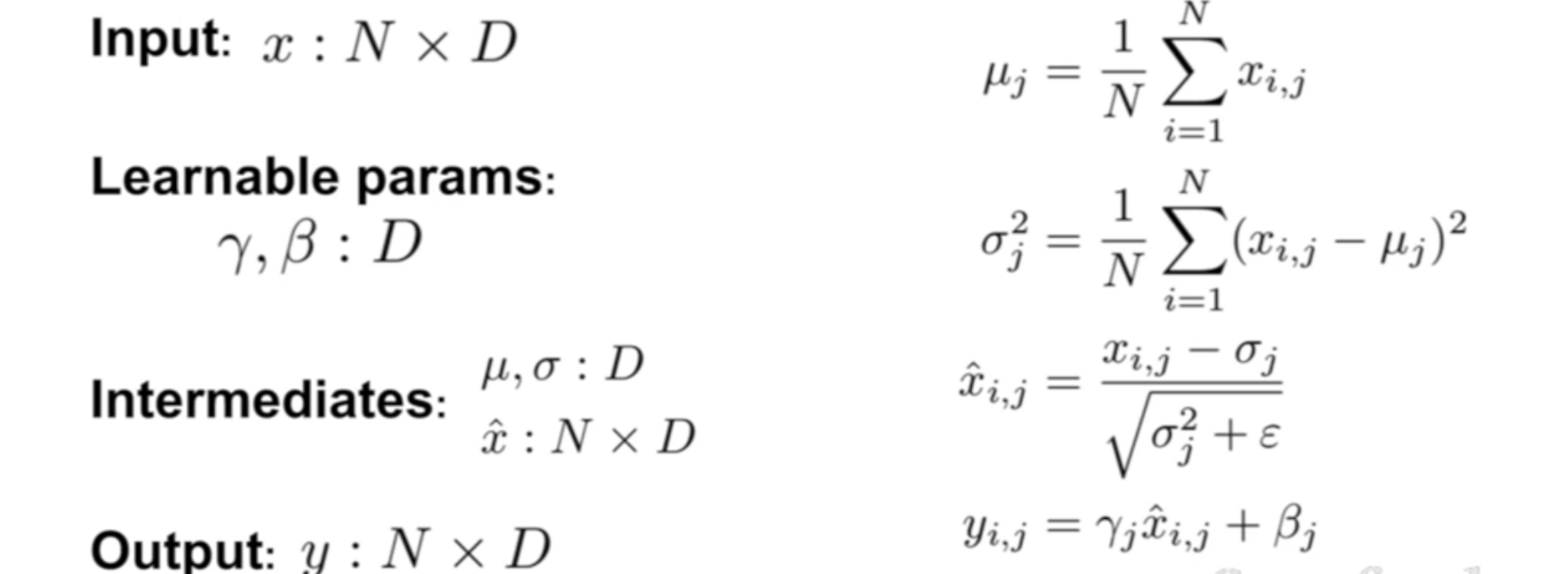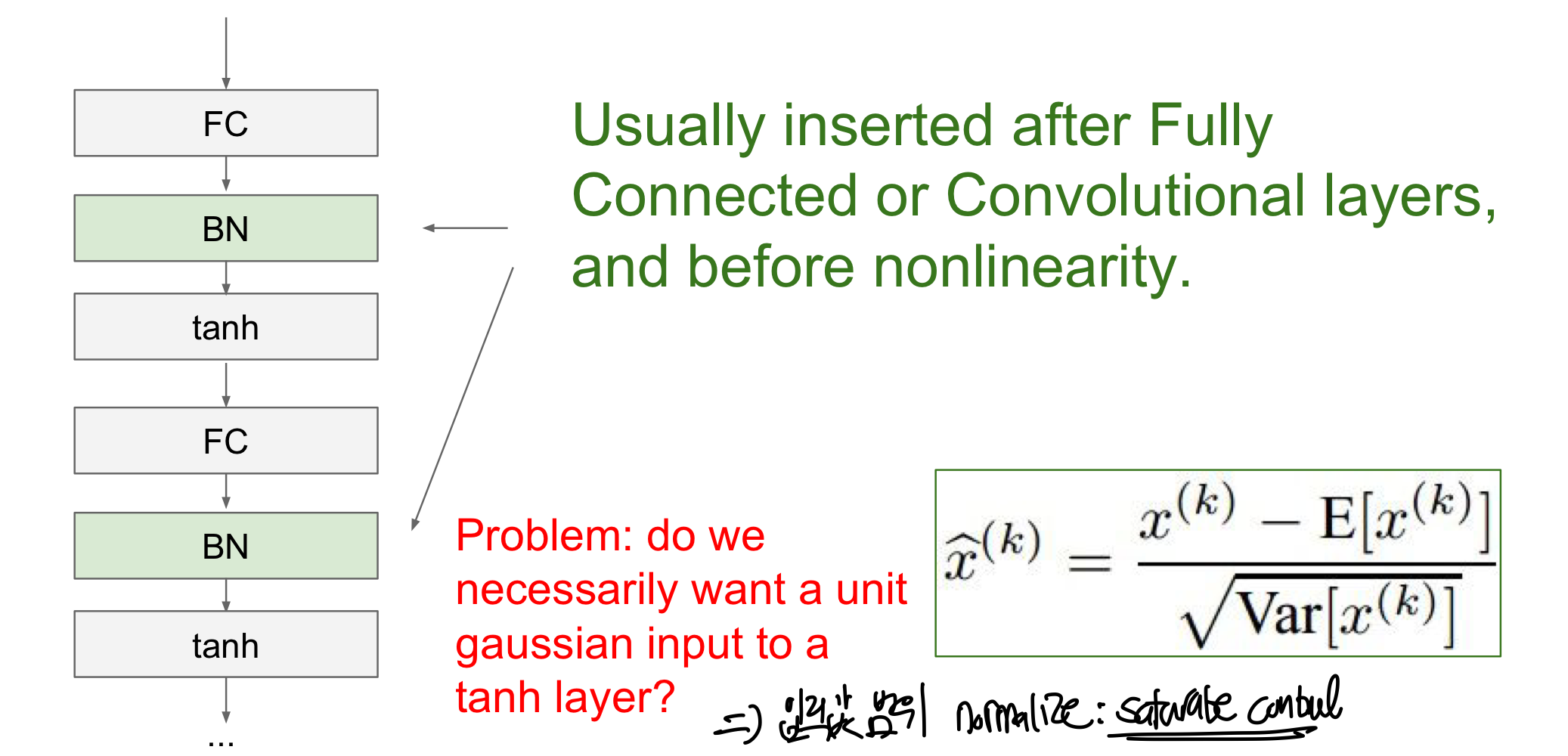 gaussian distribution에 가깝게 만듦으로써 위에서 언급한dead neuron이나saturate가 되는 문제점을 해결한다. CNN에서convolutional layer의 결과로 나온 activation map 전체에서의 평균과 표준편차를 구해 단순히 normalize를 함으로써 공간정보를 유지하되 데이터의 분포를 activation function이 제대로 동작이 가능하게 만든다.- normalize를 통해 정규분포를 따르도록하여 입력값 범위를 제한시키고 이를 통해 saturate control, flexibility(입력값 자체를 제한하여 여러가지 시도 및 function 사용가능),regularization의 효과를 얻는다. CS231n 7-2. Evaluation & Regularization