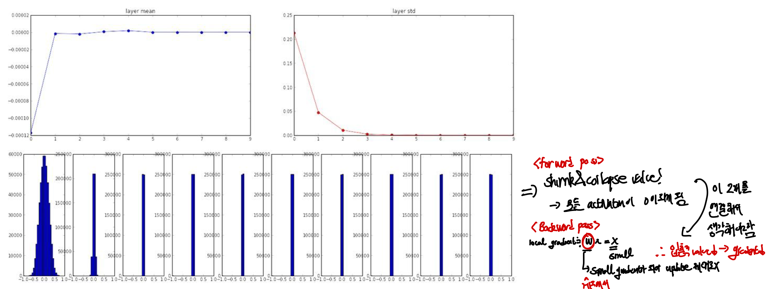forward pass에서 weight가 작을 경우 layer을 지나면서 값들이 점점 작아져 표준편차가 0이 되어 곧 모든 값들이 0으로 가게 되는 문제를 겪게 되고, backward pass에서는 결국 local gradient= x에 대한 식이 되어 ( ) 곧 gradient도 0이 되고 이로 인해 update가 진행되지 않는다. 또한 input data x 입장에서 local gradient= 에 대한 식이 되는데, 이때도 가 곧 0으로 가게 되면 local gradient의 값도 0으로 가게 된다.