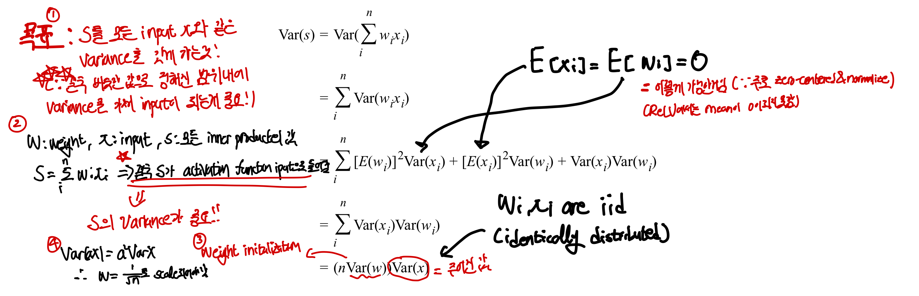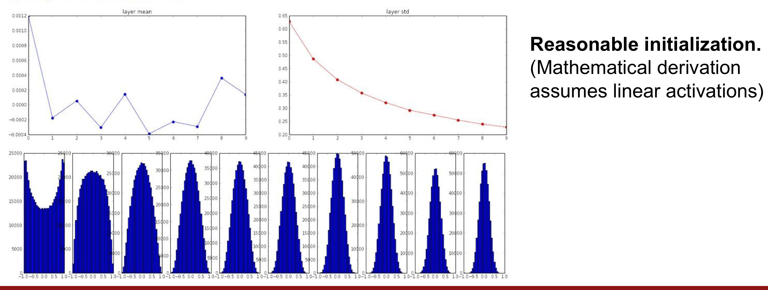 결국 위에서 문제는 weight가 너무 크면 saturate, weight가 너무 작으면 dead neuron이 된다는 점이기 때문에 중요한 것은 weight가 크지도 작지도 않은 weight로 초기화해야하는 것이다. 위의 문제점을 해결하기 위해 각각의 neuron output에 대해 variance를 1로 normalize한다. 이 방법이 강의가 진행된 시점에서 가장 많이 사용되는 방법이다!Xavier 즉,