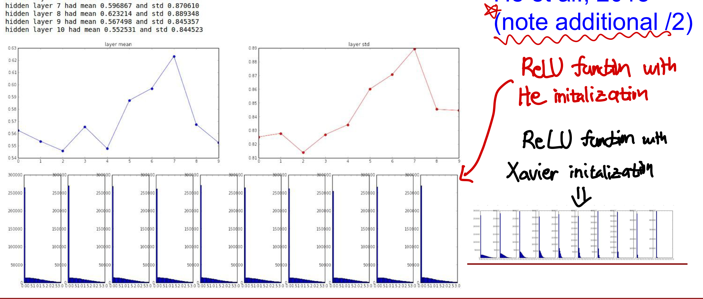 tanh가 아닌ReLU함수에서는 input 분포가 균일할때 지나갈때마다 반씩(양수반, 음수반) neuron이 기때문에 문제가 생긴다.- 편차가 강제로 반씩 되는데 이는 데이터를 보존하는데에 있어 문제가 되며 곧 표준편차가 0에 가까워져 제대로된 분포가 되지 못해 학습에 지장이 생기게 된다