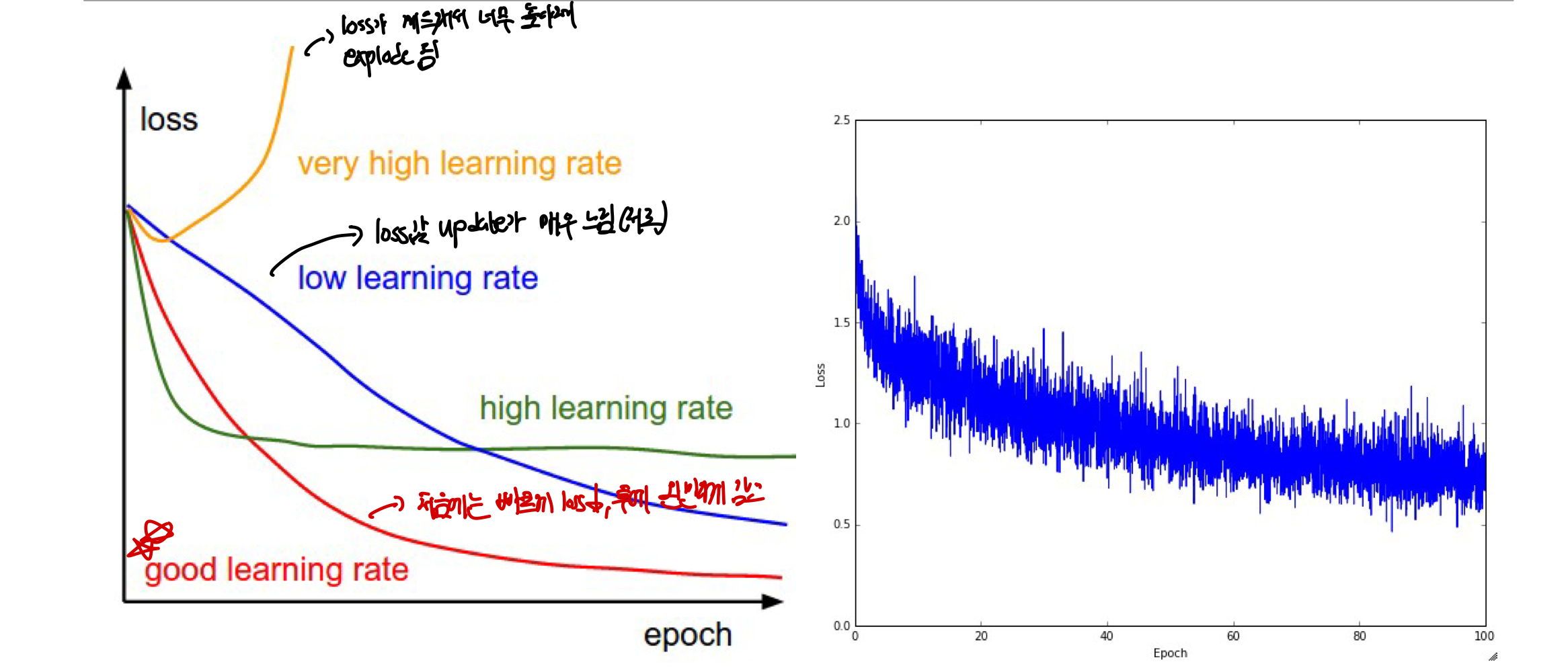 regularization 항을 낮게 설정하고 학습을 시키는데 만약 loss가 거의 바뀌지 않는다면learning rate가 너무 낮아서 그렇기 때문에 이 수치를 높여야한다. 하지만 이런 경우에도 정확도가 눈에 띄게 커지고는 하는데, 결국에는 학습이 진행중이고 이 weight들이 조금 맞는 방향으로 바뀌게 되기 때문이다(0%→10%→20%)learning rate를 크게 설정하면 loss가 Nan값이 찍히는데 이는 값이explode되기 때문이므로learning rate의 값을 줄여야한다. cost가 explode됨→ learing을 너무 많이 시킨 결과→ learning rate 줄임!