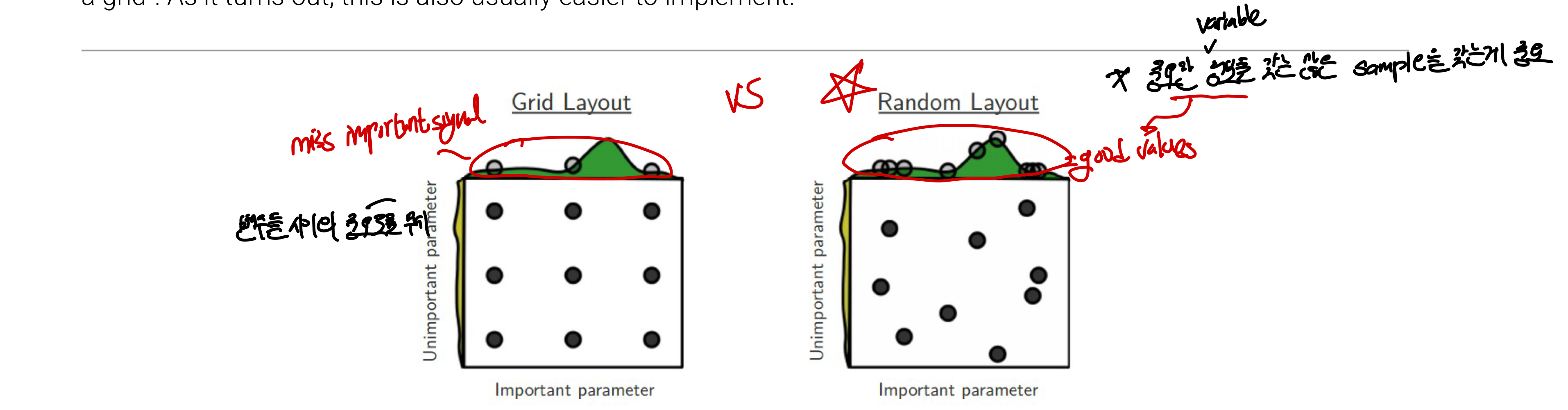 - 매개변수의 중요도에 따라 training이 가능하며 대부분의 경우 함수에 영향을 많이 미치는 parameter와 그렇지 않은 parameter가 나뉘기 때문에 중요한 parameter의 값을 더 많이 시도해볼 수 있음으로써 최적의 값을 얻어내려고 해야한다.