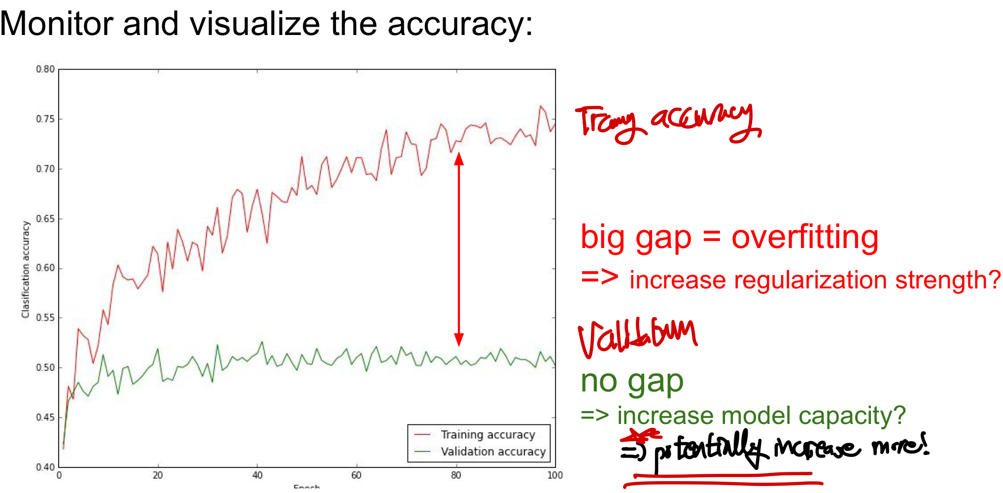 - test에 대한 결과에서 gap이 너무 클경우 과적합(overfitting)으로 인한 결과이고 gap이 없다면 더 accuracy가 증가할 가능성이 높기 때문에 model의 capacity를 늘려야한다.
