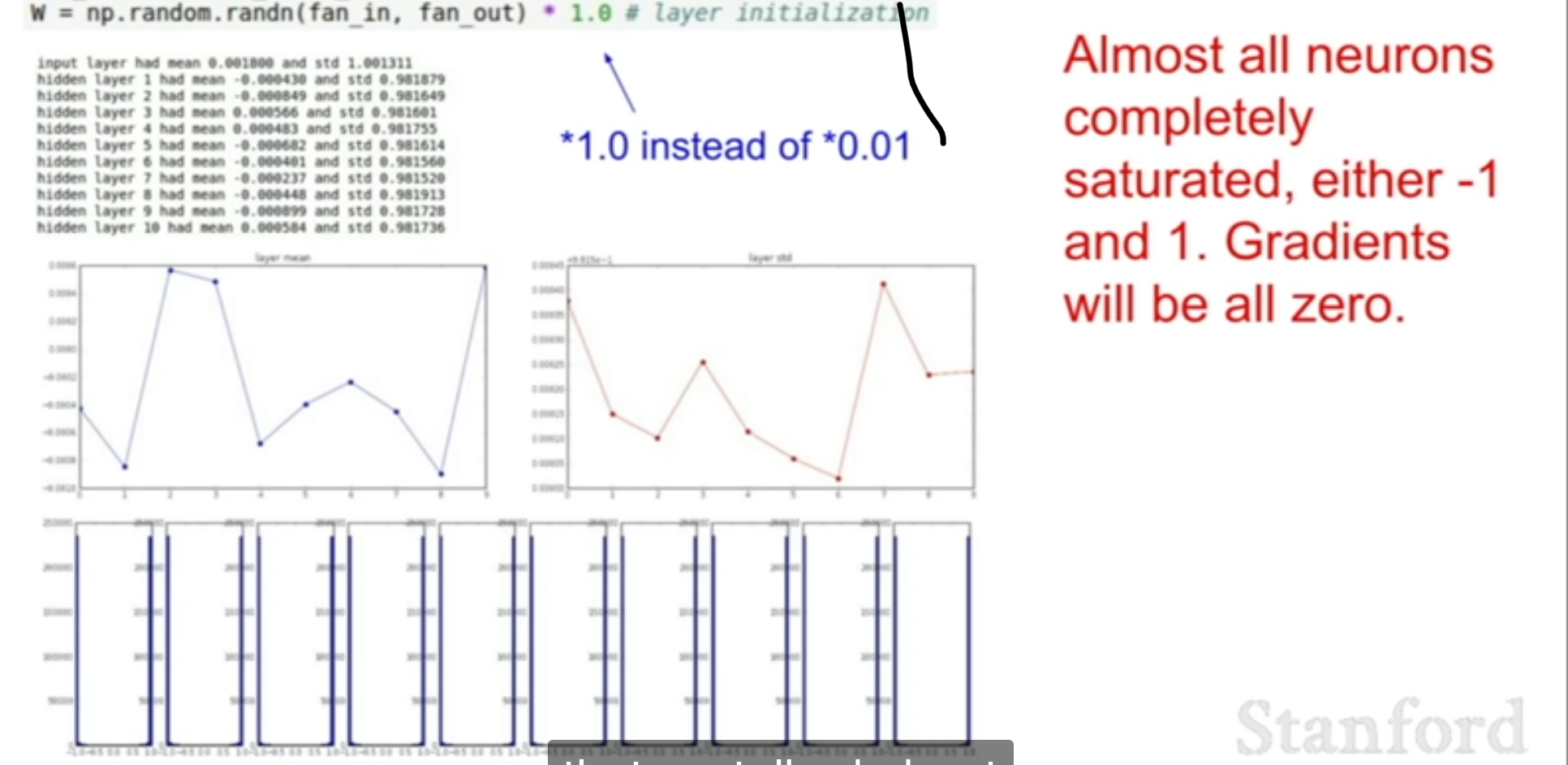위의 문제가 weight 의 값을 작게 만들어서 생기게 되었다면 weight의 값을 크게 만들면 되지 않을까? 만약 W값의 초기화를 0.01을 곱하는 것이 아닌 1을 곱한다면 어떻게 될까? 이렇게 될 경우 weigth 값이 크게 되어, activation 값이 -1 혹은 1이 되고 역전파 과정에서 local gradient의 값이 0에 가까워져 포화가 됨에 따라 제대로 된 학습이 불가능하게 된다.