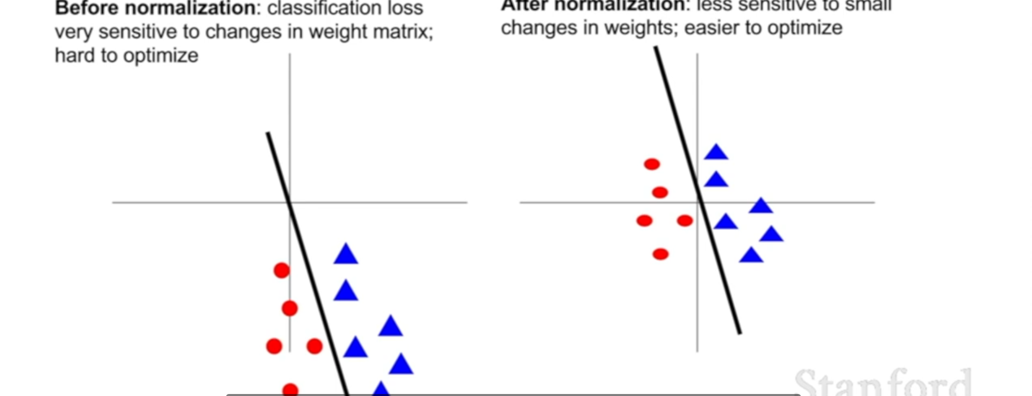 linear classification에서 normalization을 할 경우 아래와 같은 이점을 가지게 된다! 분류를 담당하는 선이 조금 움직이더라도 분류하는데에 큰 영향을 주지 않아 최적화하는데 도움을 줄 수 있다.