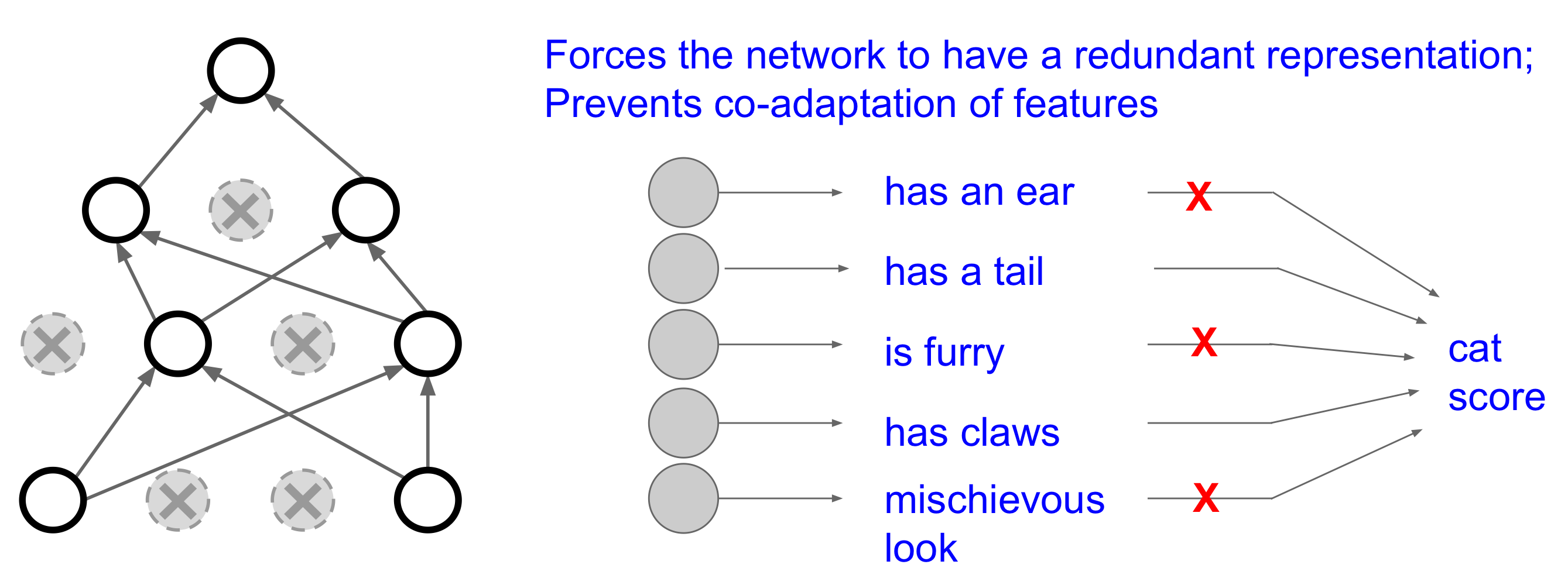 p의 확률로 neuron이 active될지가 정하는 방법으로 regularization이 가능하게 만든다. 결국 더 간단하게 모델을 만드는 것이 목표이므로, 특정 class를 분류하는데 사용하지 않는 neuron들은 이용하지 않음으로써 과적합을 맞고 필요한 특성들만 사용하게 만드는 방식이다 ! 5. Dropout and Batch Normalization