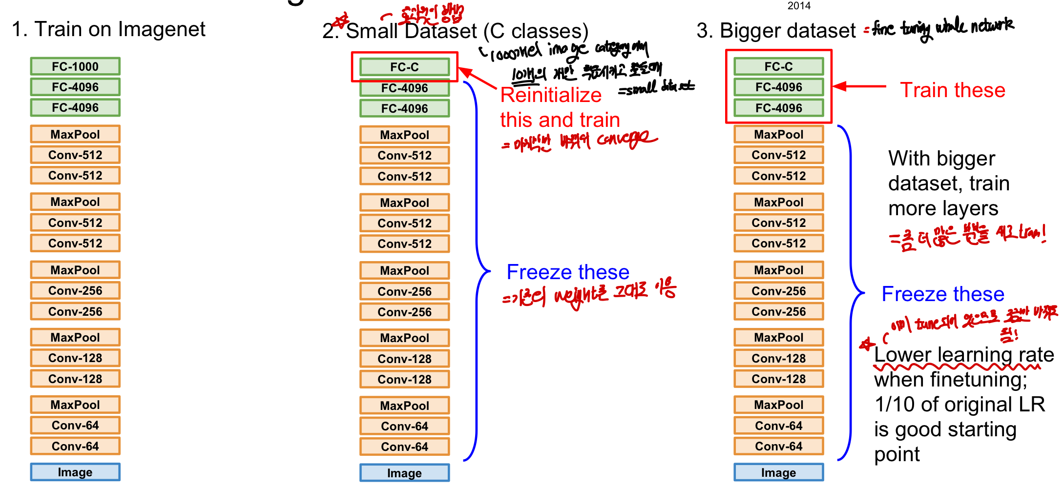- 적은 클래스를 분류하는 알고리즘을 만들고 싶은데 데이터도 적은 경우 맨 마지막 FC layer만 weight들을 초기화하여 C개의 score을 내보내도록 바꾼다. 이후 갖고 있는 작은 데이터셋을 이용해 class score을 도출하고 학습을 진행시킨다.