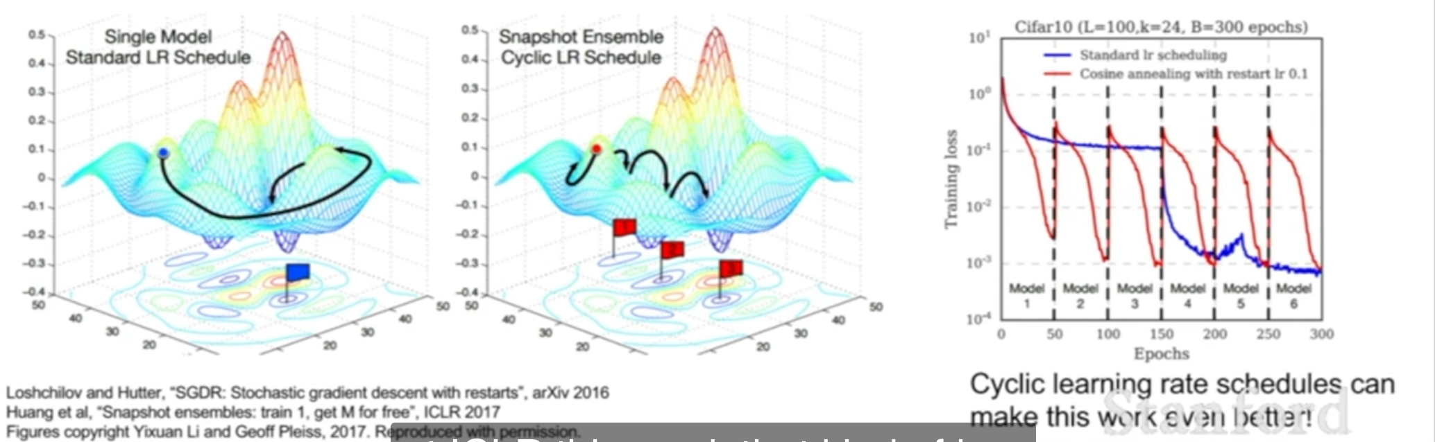 또한 아래 그림과 같이 하나의 모델에서 learning rate를 매우 빠르게 하거나 느리게 조절하여 각 모델(snapshot)마다 다른 최적점에 도달하게 만들어 이것들을 ensemble하는 방법도 존재한다.