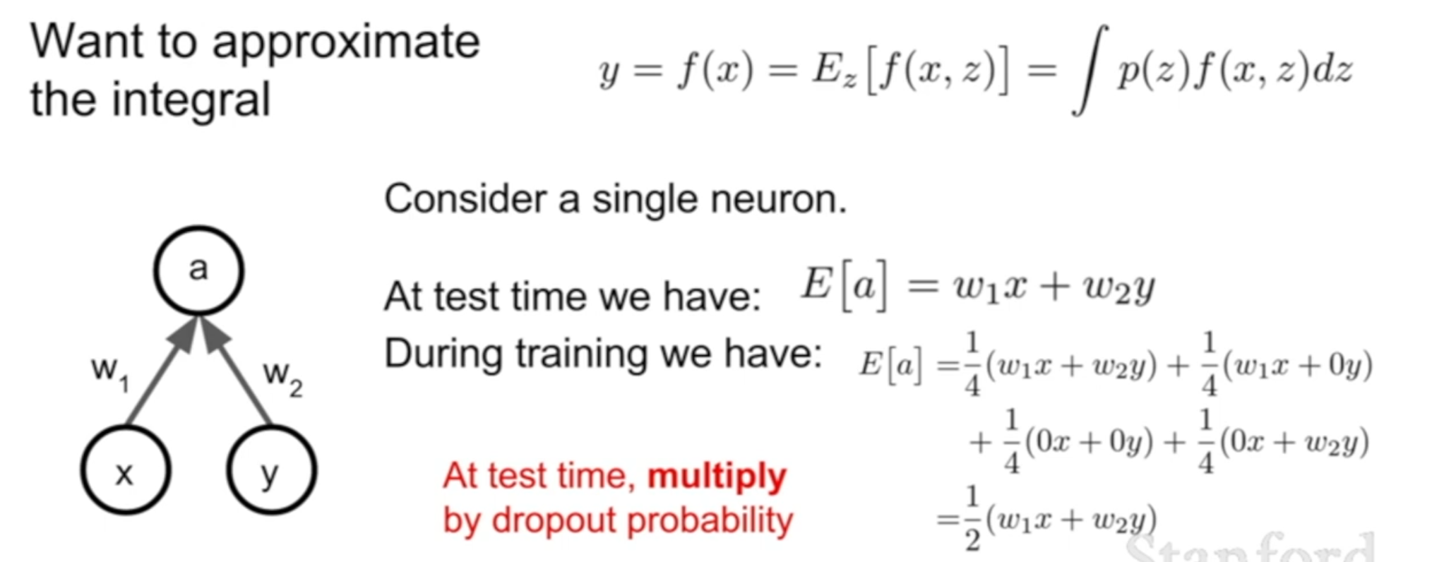 - test output에 p를 곱해야 training한 애들과 같은 값을 가져 정확한 분류가 가능하므로 만큼 곱해야하고 이는 적분을 이용해 평균을 내는 것이 어렵기 때문에 근사한 방법이다. 혹은 training을할 때 dropout한 결과에 를 나눠 test할 때 를 곱하지 않아도 되게 만들 수도 있다..