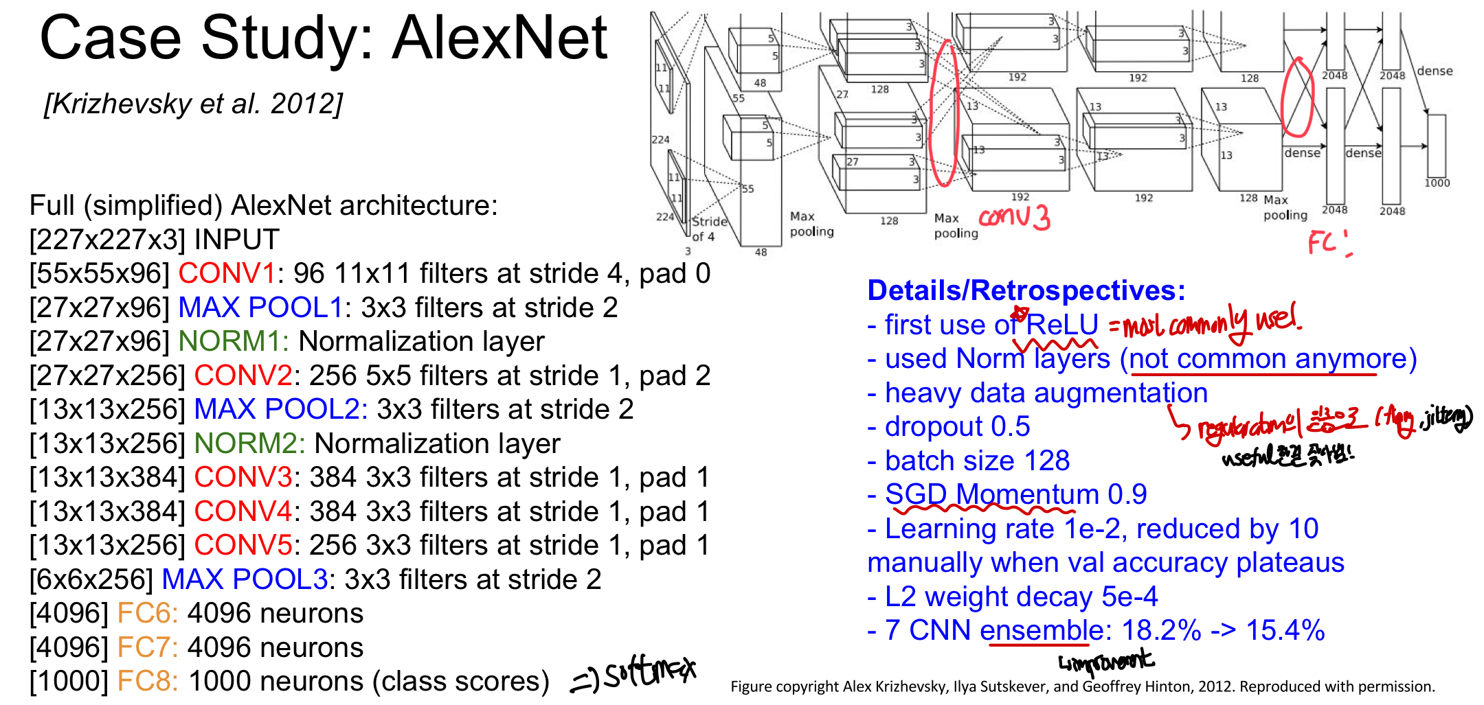 Krizhevsky et al. 2012: 최초의 large scale CNN으로 imageNet 분류 관련 작업을 잘 수행한 모델로 최초로 ReLU를 사용한 것이 특징이다ReLU