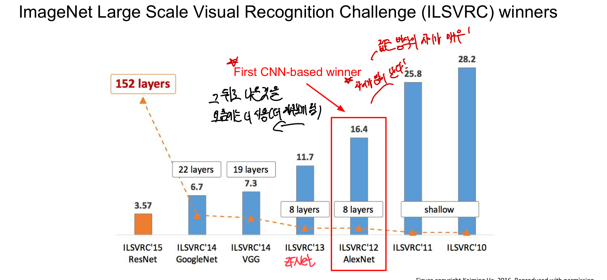 - 2012년에 최초로 CNN의 기초위에 만들어진 이 모델은 기존의 그 이전의 모델과 차이가 매우 많이 났으며(25.8→16.4) 이모델의 기초위에