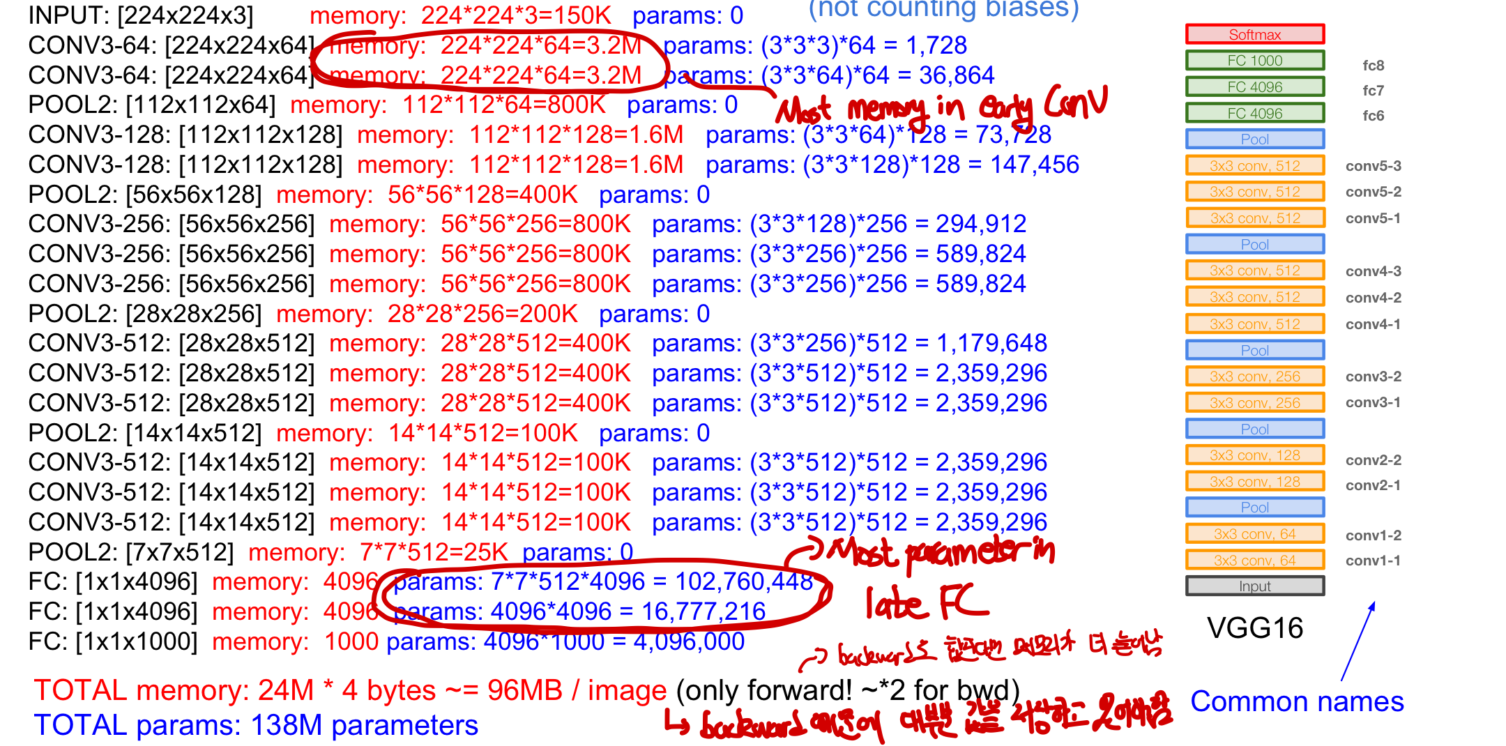 FC7 layer에 feature들이 일반화가 매우 잘되어 있어 다른 작업을 하는데에 활용을 많이 한다- 대부분의 memory는 처음의 Conv layer에 몰려있으며 forward pass에서 하나의 이미지당 약 100MB가 필요해 메모리를 많이 사용한다는 문제를 갖고 있다.(⭐️backward pass에서 chain rule을 통해 update하기 위해서는 정보의 저장이 필수적이다!)