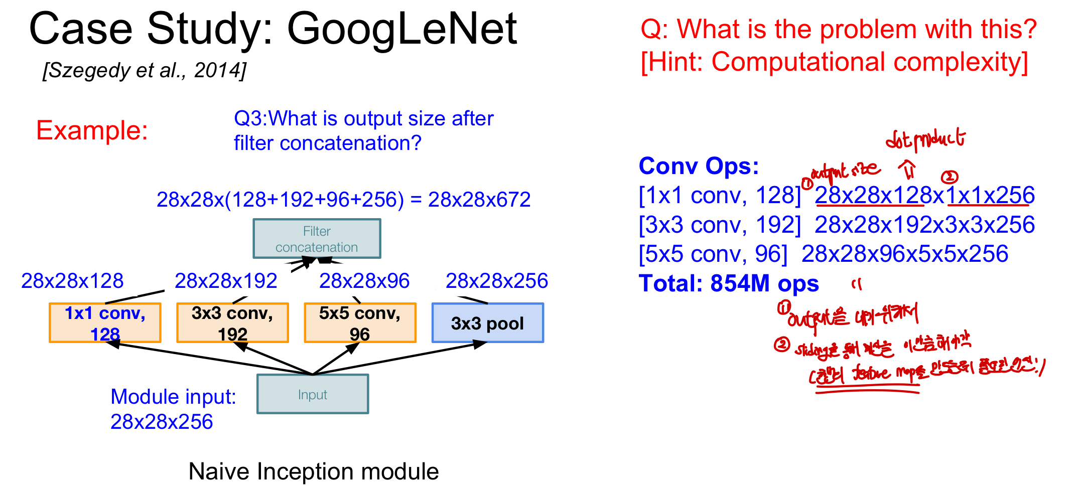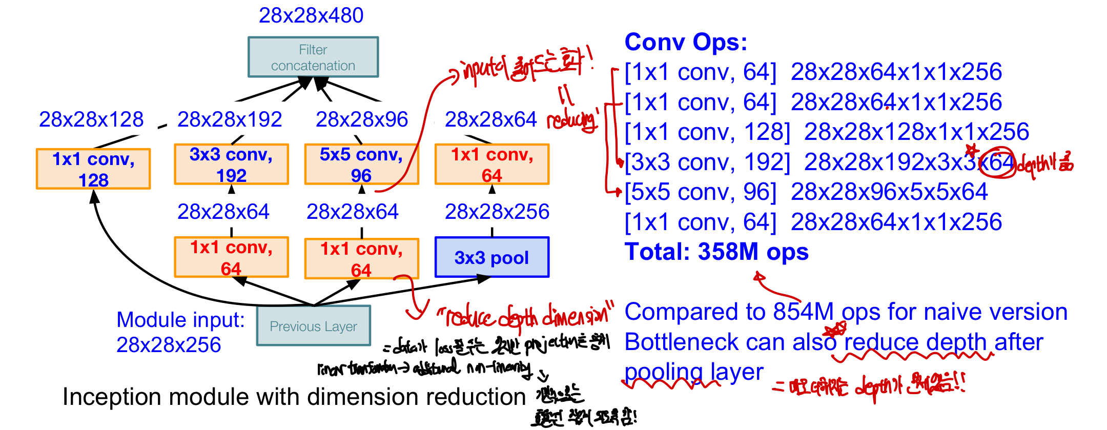 naive inception module에 비해 연산 횟수를 줄임! - pooling layer의 경우는 그 자체로 똑같은 size를 output으로 가지기 때문에 pooling layer 이후에 1X1 conv layer 배치해도 됨