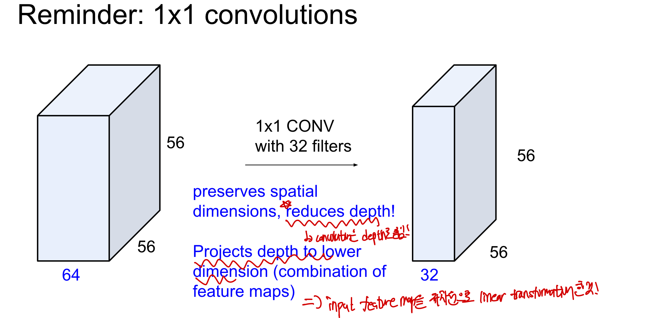 - input을 linear transformation하여 저차원으로 projection한 것이라고 생각하면 되며 1X1 Conv를 중갅중간에 배치하여 저차원으로 만듦으로써 연산비용을 줄일 수 있게 만든다