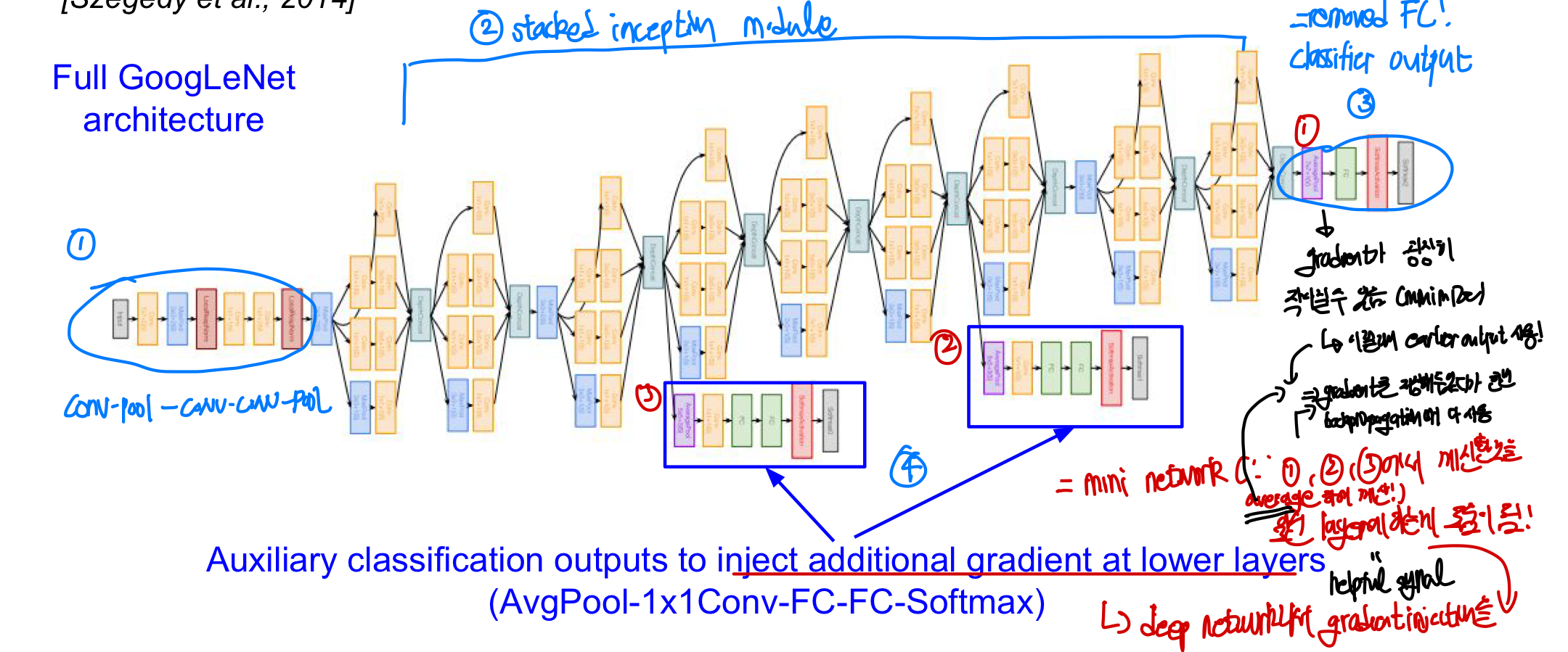 Auxiliary classificaiton: 얕은 layer에 추가적인 gradient 계산기를 추가- 깊은 layer을 가지고 있기 때문에 1) backpropagation 과정에서 gradient가 소실되는 문제점과 2) 초기 단계에서 유용한 특징을 학습하지 못할 수 있는 문제점을 해결한다