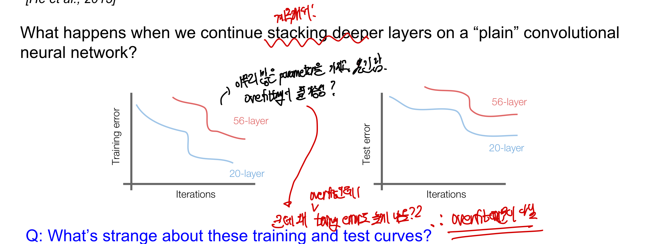 - Training error: deep layer 모델의 정확도가 여전히 더 낮은데 이는 과적합 이외에 다른 문제가 있음을 시사한다