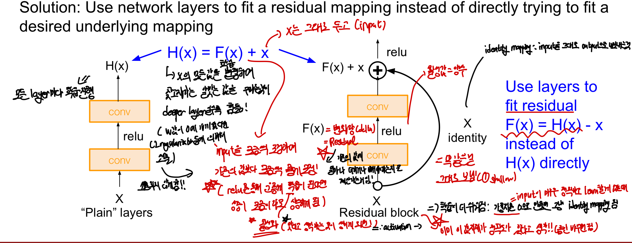 Plain layer: 모든 layer에서 input의 모든 값들을 학습하여 최적화를 진행하는데, 이럴 경우 weight의 gradient 값들이 0에 가까워지면서 소멸될 가능성이 높아져 최적화가 어려워진다. 즉, ⭐️기존의 input 자체를 최적화하는 방법은 layer이 깊어지게 되면 학습이 어려워진다. -