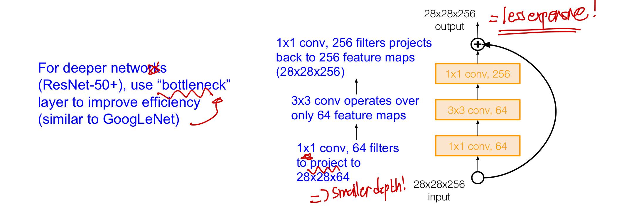 GoogLeNet에서 output size와 operation를 줄이기 위해 1X1 Conv를 추가했다 싶이 여기서는 input size를 줄여 operation의 cost를 줄인 후 다음 layer로 가기전에 다시 크기를 원상복귀 시키는 방법을 사용한다!(input과 residual의 차원이 같아야 함)