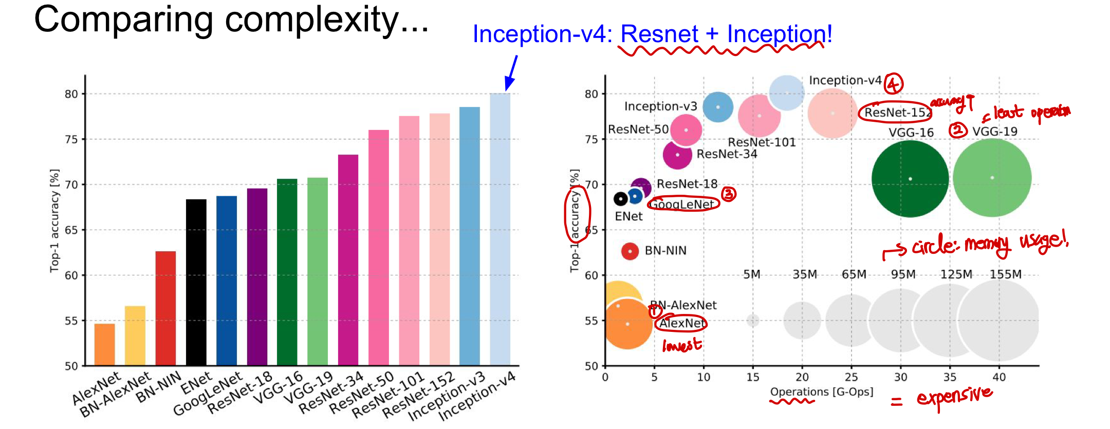 AlexNet: less expensive하지만 정확도가 낮음(일단 정확도는 높아야지 그다음에 다른 걸 생각할 수 있음)VGG: 정확도가 올라갔지만 연산 비용이 비싸며 memory를 많이 사용함GoogLeNet: VGG의 높은 memory사용과 높은 계산 비용을 FC의 제거와 inception module (bottleneck) 방법을 통해 해결하며 비슷한 정확도에 획기적으로 적은 메모리 사용량을 얻어냄- ResNet: 매우 많은 layer을