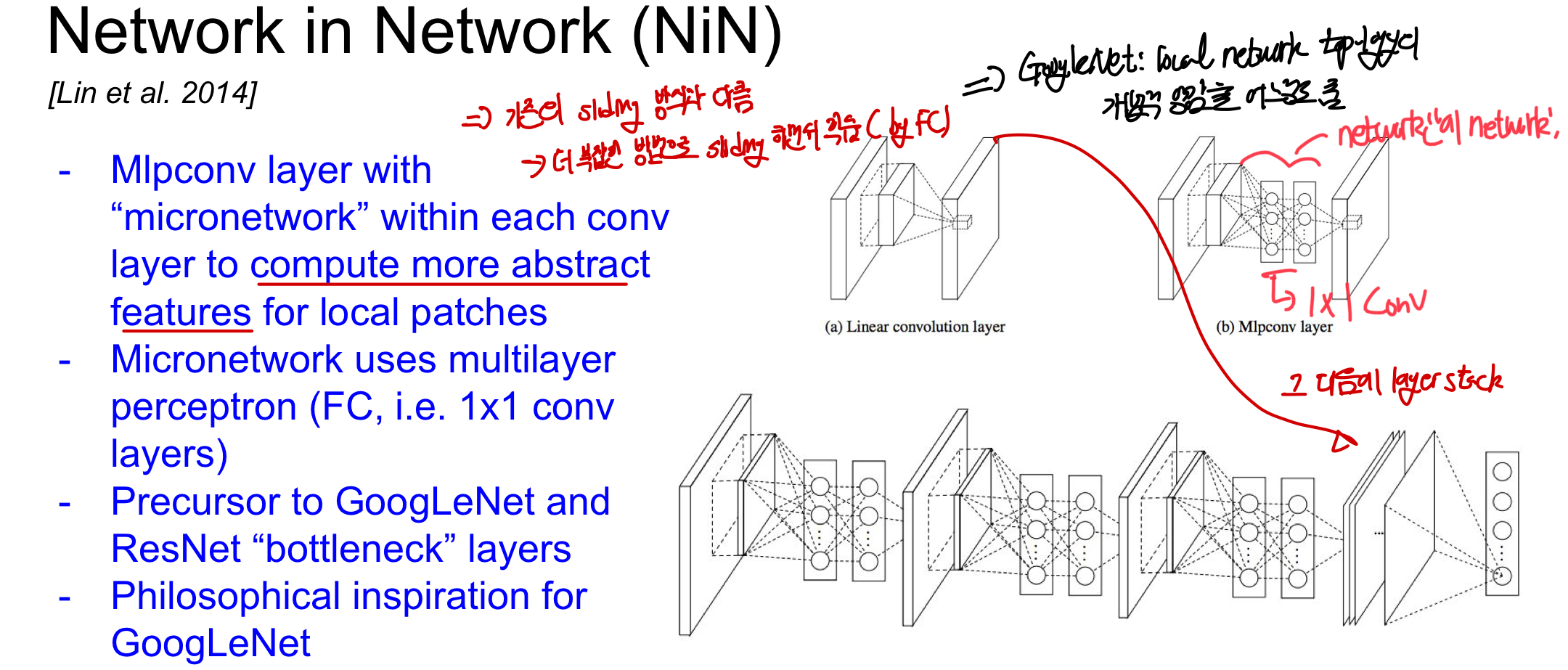 GoogLeNet과 ResNet의 bottleneck 개념에 선구자인 논문이라고 볼 수 있으며 GoogLeNet에 영감을 주었다는 점(네트워크 안에 네트워크)에서 한번쯤 확인해볼만한 모델이다