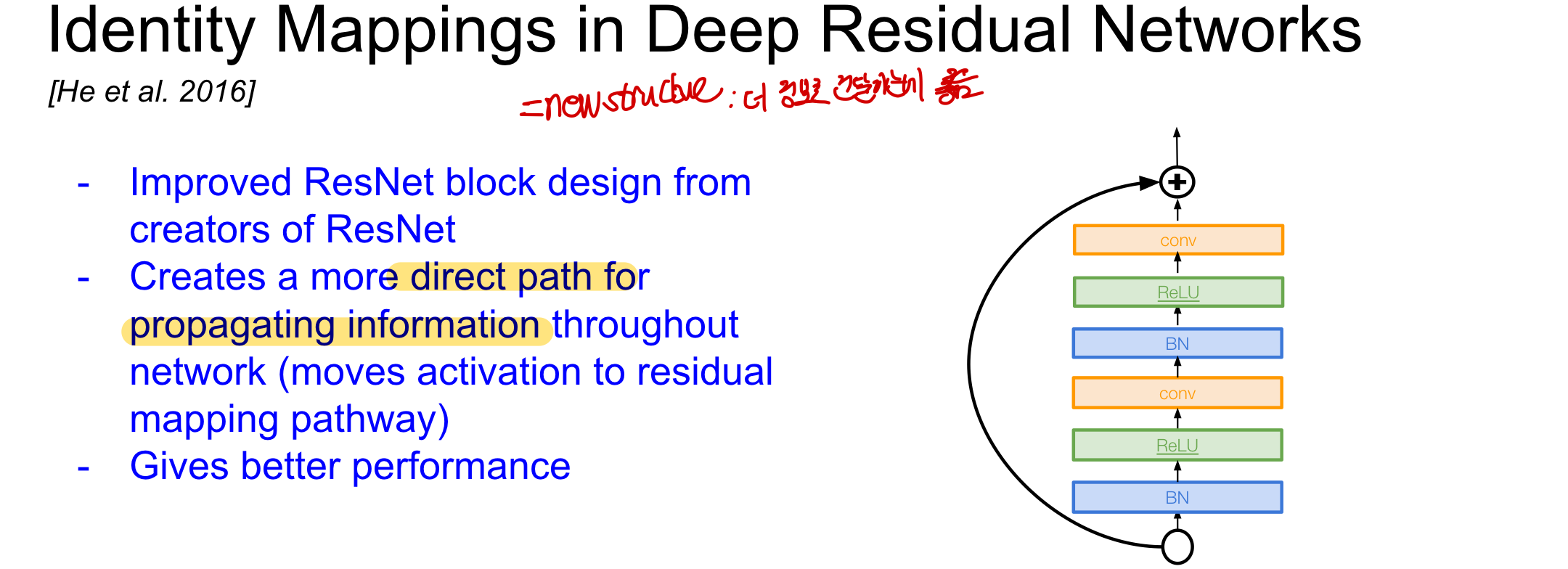Resnet의 block 디자인을 바꾼 것으로 direct path를 늘려 정보들이 더 앞으로 잘 전달되고 backpropagation도 잘 될 수 있도록 개선하여 성능을 높인 방법이다.(지름길의 길이를 늘림)