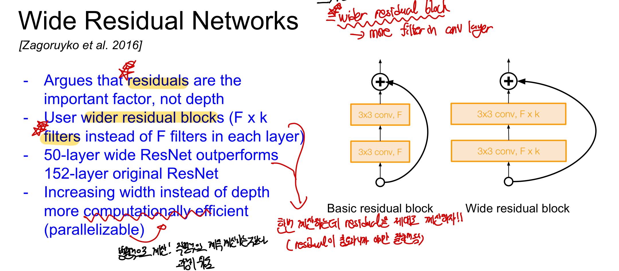 residual block을 더 넓게 만듦으로써 residual의 역할을 강조하였고 실제로 50개의 layer로 152개의 layer이 있는 ResNet보다 더 나은 성능을 만들어 냈다. 또한 residual block을 늘림으로써 depth를 늘리는 것보다 병렬적으로 계산하게 만들어 효율적인 연산을 가능하게 만들었다. 네트워크의 depth를 늘리는것은 sequential한 증가이므로 계산이 조금 더 복잡하게 되며 단순한 내적 연산이 아닌 복잡한 연산이기 때문에 효율적이지 못하다