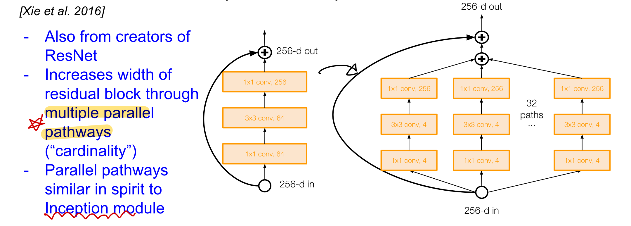ResNet의 후속작이라고 생각하면 되며 residual block의 width를 multiple parallel pathway(다중 병렬 경로)로 만들어 성능을 향상시켰다. 위의 Wide ResNet과 같이 width를 늘려 연결한다는 점에서 비슷하며, 병렬적으로 묶는다는 점에서 GoogLeNet의inception_module 과 비슷하다고 볼 수 있음 ➡️ inception + residual + wide