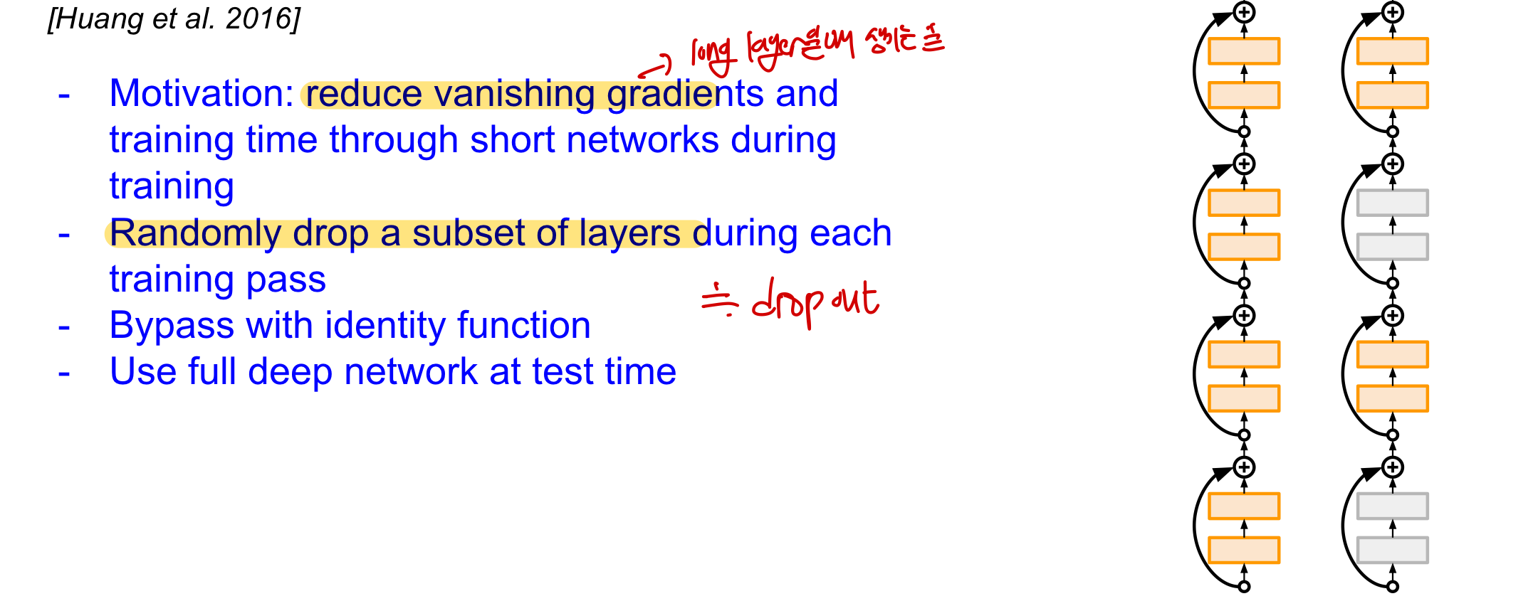 stochastic_depth CS231n 7-2. Evaluation & Regularization에서는 특정 map만을 dropout 하는 경우가 있는데 여기서는 아예 특정 layer을 dropout한다고 생각하면 된다