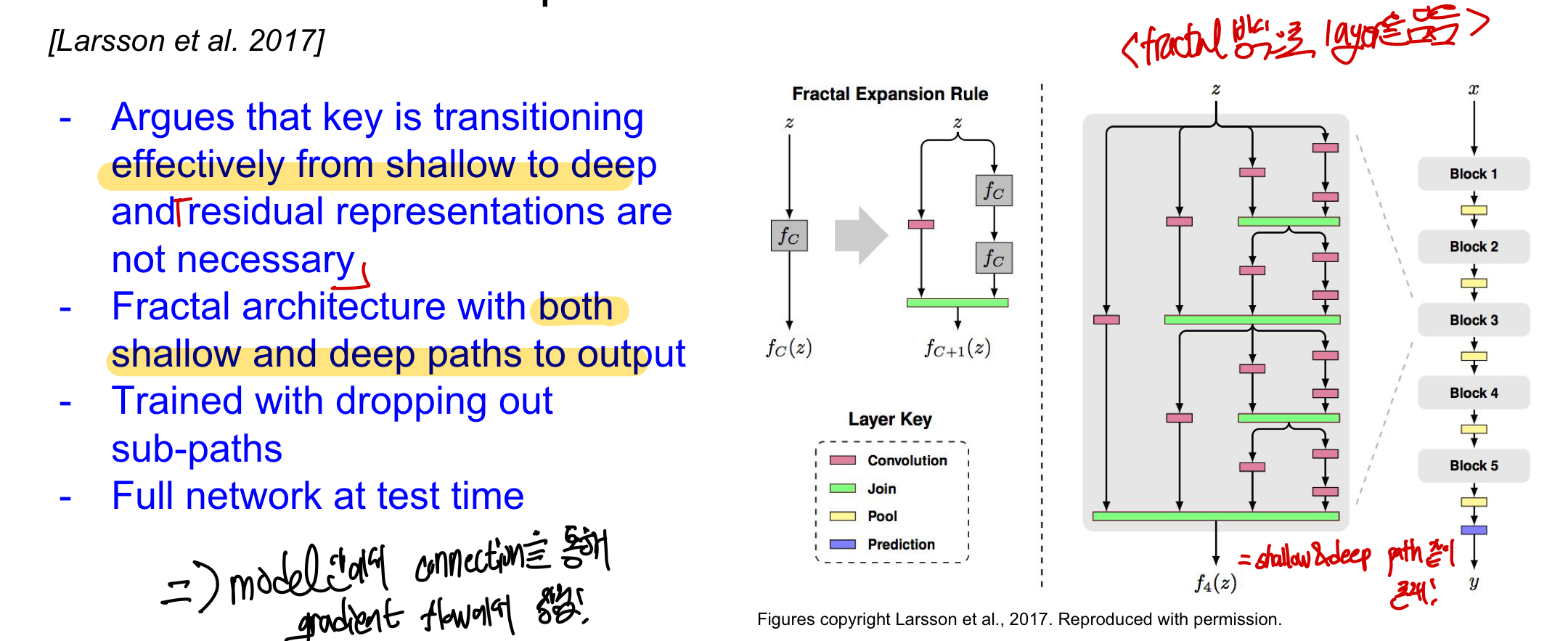 중요한 것은 residual이 아니며 실제로 중요한 것은 간단한 네트워크에서 복잡한 네트워크로 복잡한 패턴을 안정적으로 학습할 수 있도록 전환하는 것이라고 본다. 이 모델은 layer을 담는 방식이 fractal 방식이고 각 경로는 서로 다른 깊이를 가지고 중첩되며 이러한 연결을 통해 gradient flow에서 장점을 얻게 된다.
