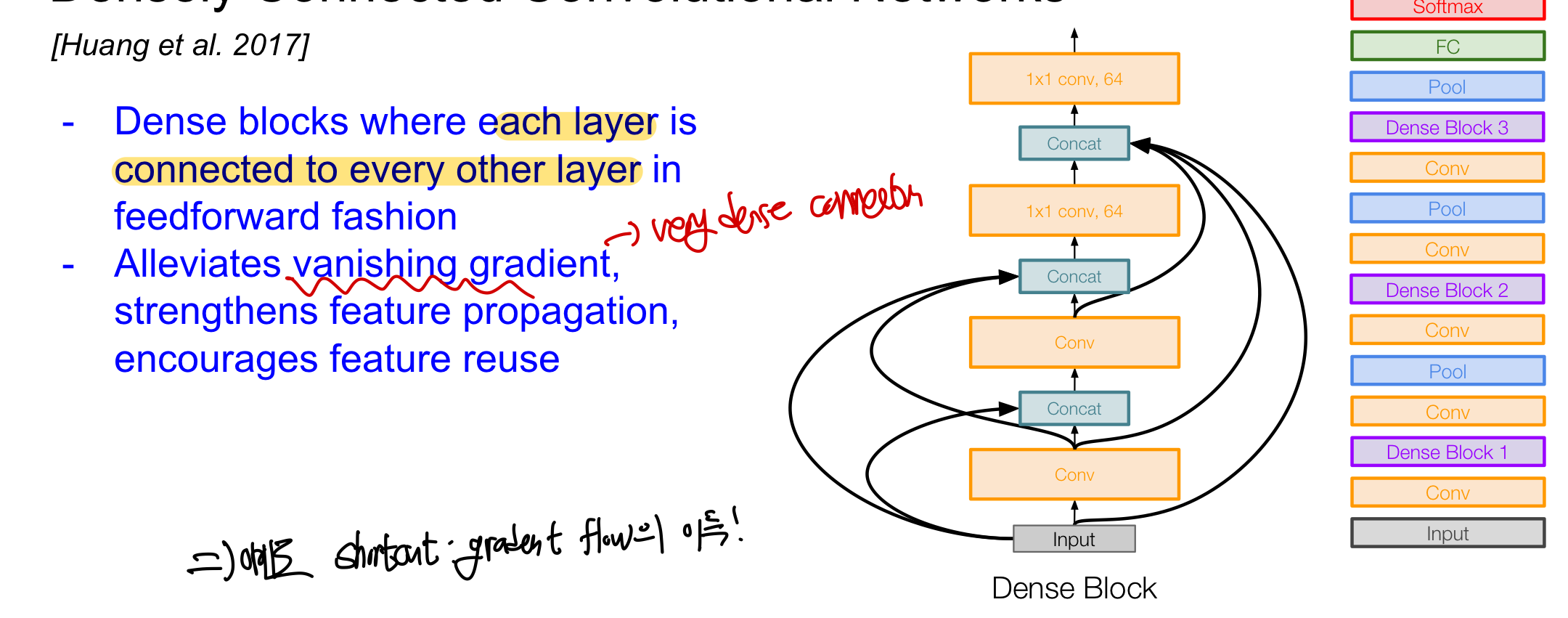 한 layer가 그 layer 하위에 있는 모든 layer와 연결이 되어 있어 있으며 FractalNet와 유사하게 shortcut을 이용한 gradient flow에 이득을 얻는다!