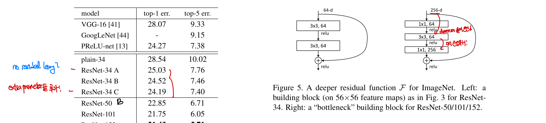 50-layer ResNet: 기존에 2layer씩 묶어 residual learning을 진행한 34-layer짜리 network를 3-layer bottleneck 블럭으로 바꾸어서 만들었다. (34X1.5) 이때 차원의 증가는 위의 B방법(차원을 키워줄 때만 projection)하는 방법을 사용하였다. 총 38억개의FLOPs(1초당 수행되는 부동소수점점 연산의 수수를 가진다.(FLOP이 많을 수록 더 복잡함)101-layer & 152-layer ResNet: 더 많은 3-layer bottleneck 블럭을 통해 깊이를 더 높이고, 이렇게 깊이가 늘어났음데 VGG net보다 더 적은 FLOPs를 가져 더 낮은 복잡도를 가졌다(110억 VS 150억)
