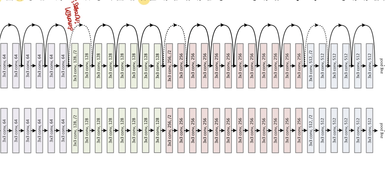 또한 Identity VS Projection shortcut에서 얘기했다싶이, projection shortcut을 사용하게 될 경우, dimension(특성맵의 차원)이 2배로 증가하는 경우, 시간복잡도와 모델의 크기가 두배로 가지기 때문에 parameter가 없는 identity mapping를 사용하는 것이 매우 중요하다! 밑에 사진에서 점선이 dimension이 증가하는 부분!