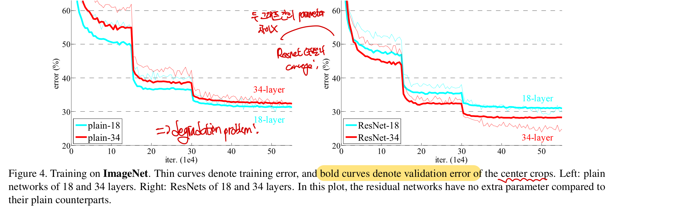 3.Network Architecture에서 언급했던 plain network에 대한 성능 보면 18-layer로 이루어진 network보다 34-layer로 이루어진 network에서 validation error가 높아 기존의 degradation 문제를 해결하지 못한 것을 알 수 있다.
