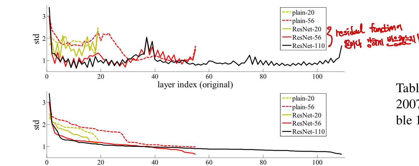 layer의 반응(response)의 표준편차를 통해 ResNet의 효율성을 입증하였다. 이때 말하는 반응(response)는 Batch Normalization 이후에 3X3 layer의 결과물로 activation function이 적용되기 전 단계이며 resdiual function의 반응 강도를 알 수 있다 . 실제로 ResNet에서 plain network보다 일반적으로 적은 반응(response) 이 나타났고 이것은 non-residual function보다 0에 가깝다는 것을 의미한다. 또한 아래 사진에서와 같이 layer이 증가할 수록 오히려 signal을 적게 바꾼다는 것을 알 수 있다. (학습이 거의 완료되어 학습이 크게 일어나지 않아 residual이 0인 값 증가)