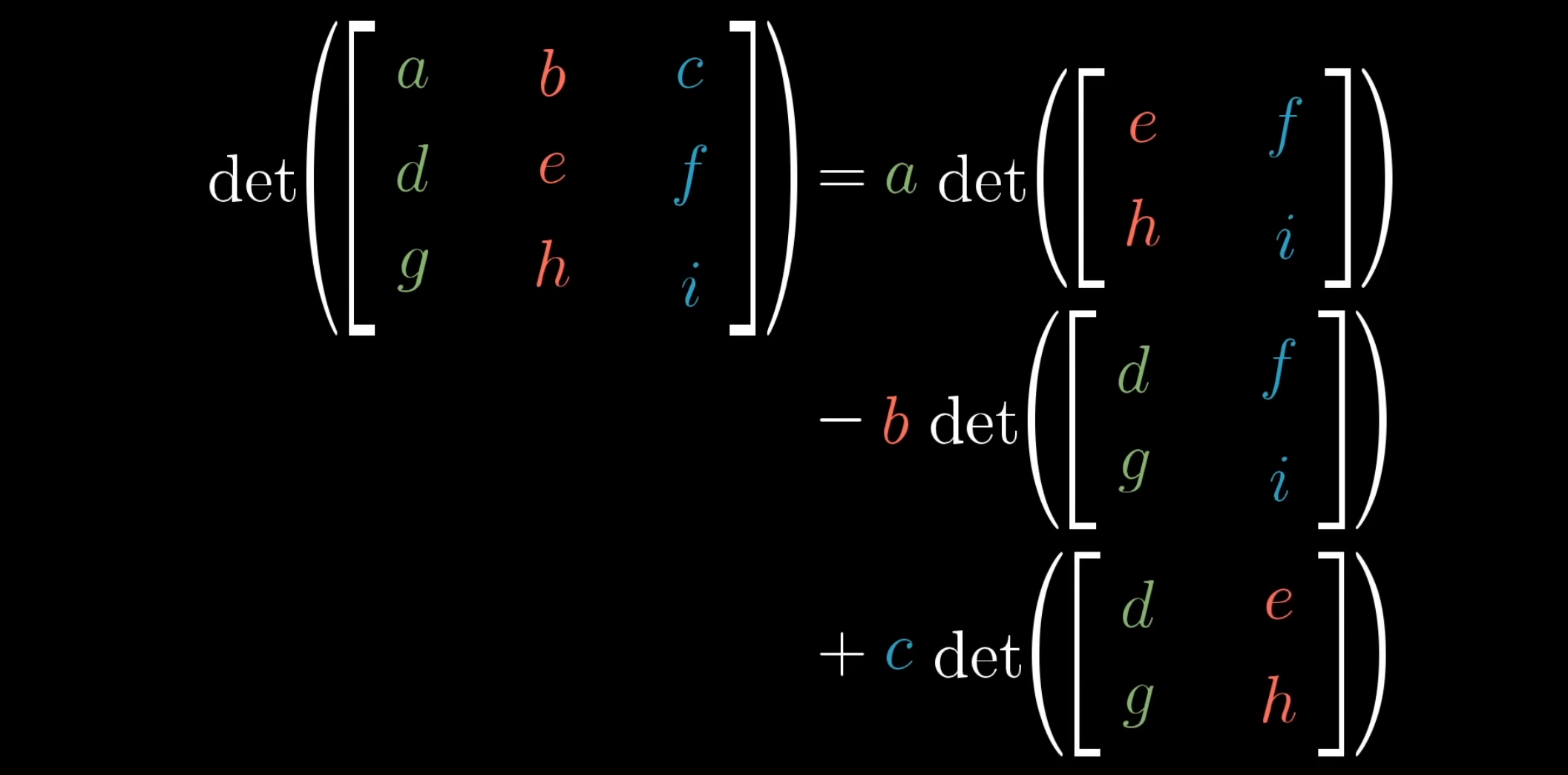 Sal khan 동영상에 determinat 계산방법이 자세하게 나와있으며 아래는 3차원일때 determinant 구하는 방법